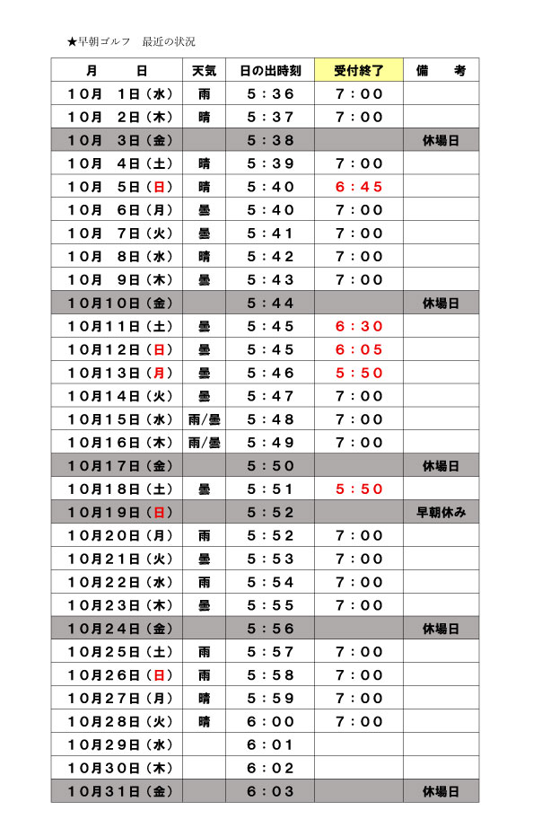 早朝ゴルフ受付終了時刻 9月