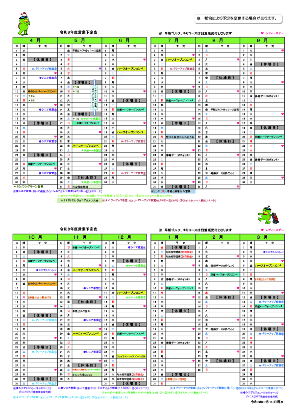 | ★早朝ゴルフの営業期間は、令和8年4月1日(水)から11月28日(土)まで。 令和9年3月8日(月)から3月31日(水)まで。 ※早朝ゴルフ休場日:金曜日、11月15日(日) 【但し、5月1日(金)、8月14日(金)は営業】 |