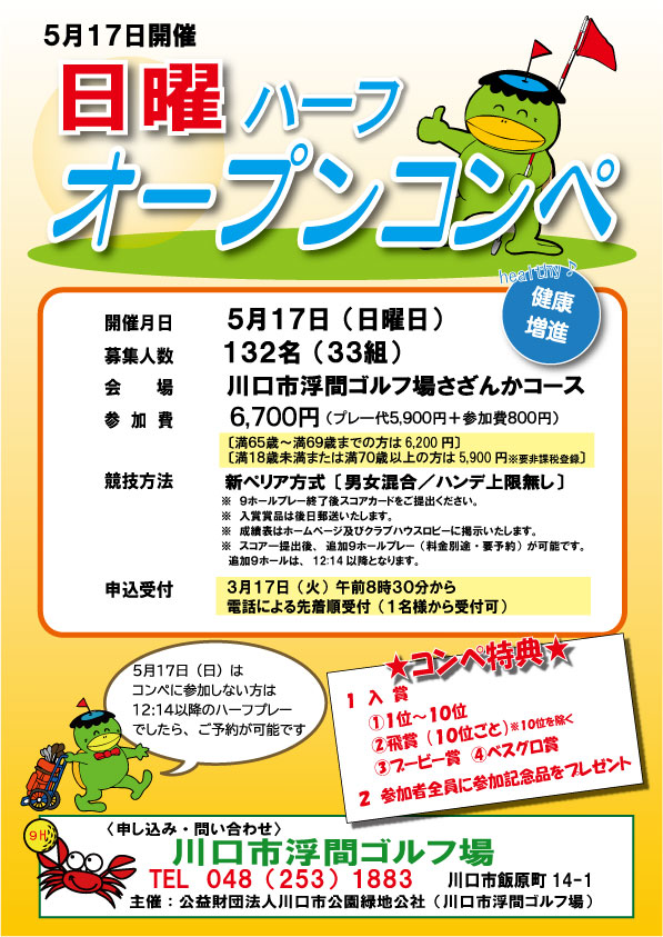 | 梅雨入り前のゴルフシーズンに浮間ゴルフ場のハーフコンペはいかがですか? |